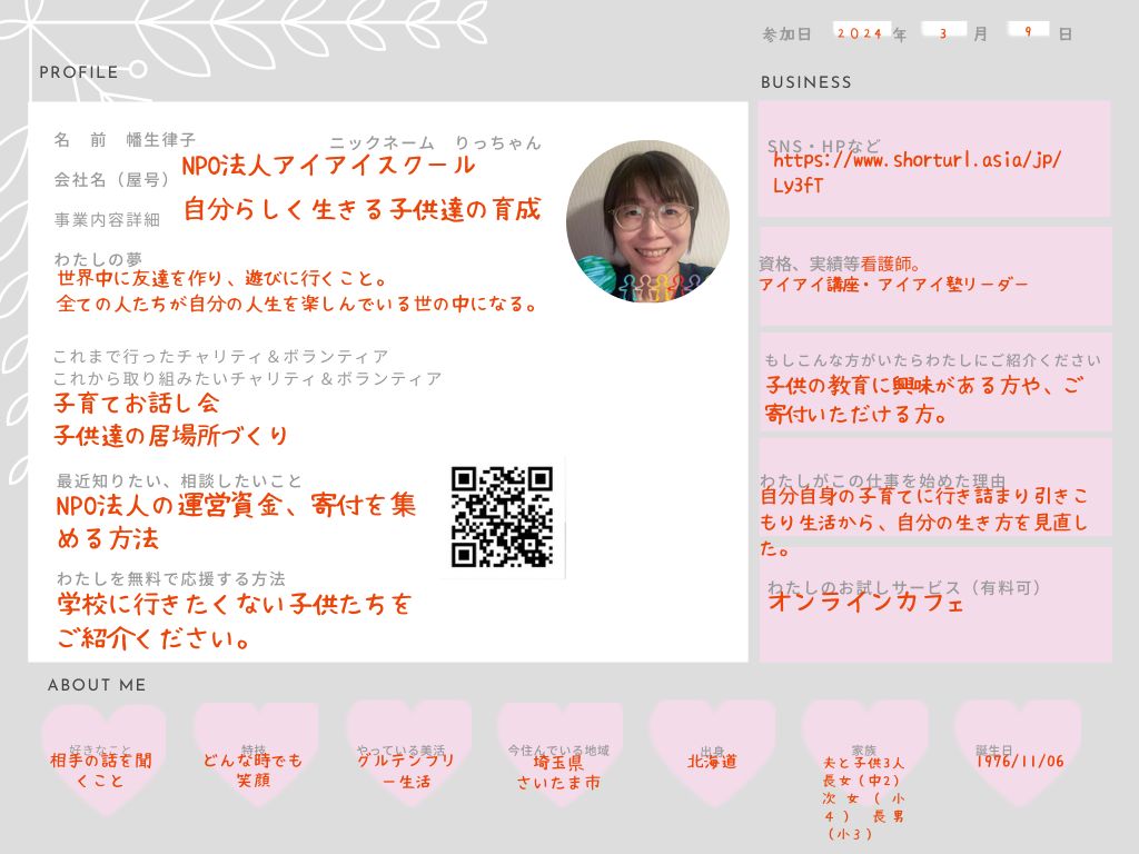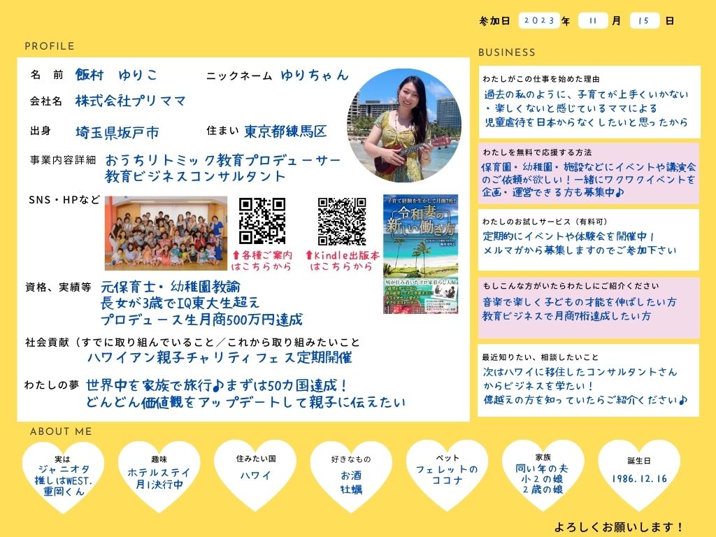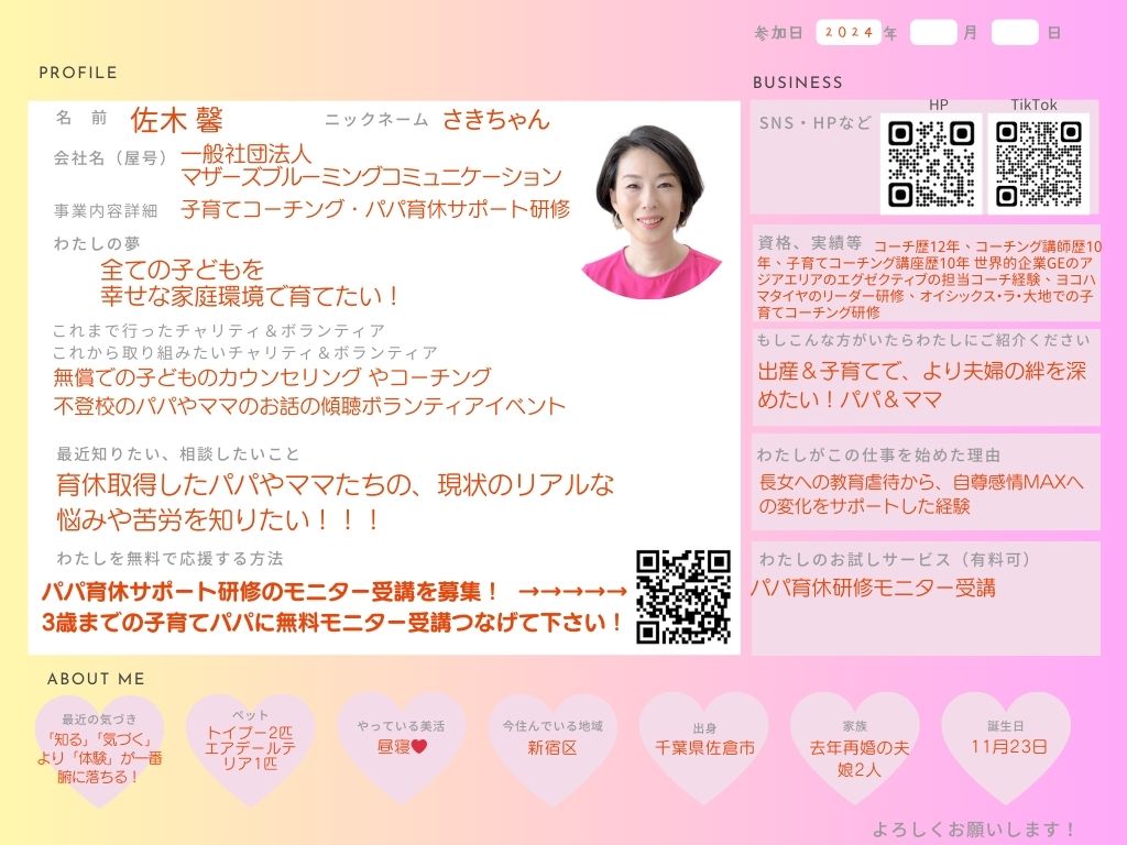 ひとこと: ママが輝けば子どもはもっと輝ける!子どもたちに輝く背中を魅せられるママと教育者を育成し、児童虐待をゼロにすることを使命として活動しています。