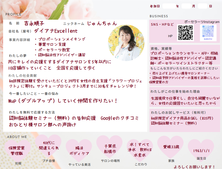 検索キーワード: プロポーションカウンセラー、認知脳活性アドバイザー、Wupコンサル、認知症予防、健康経営、メンズダイエット、着るエステ®