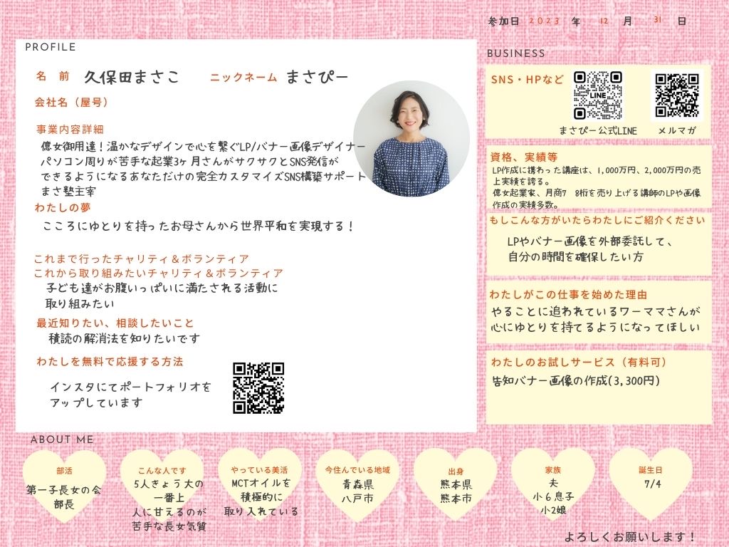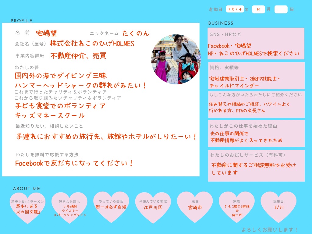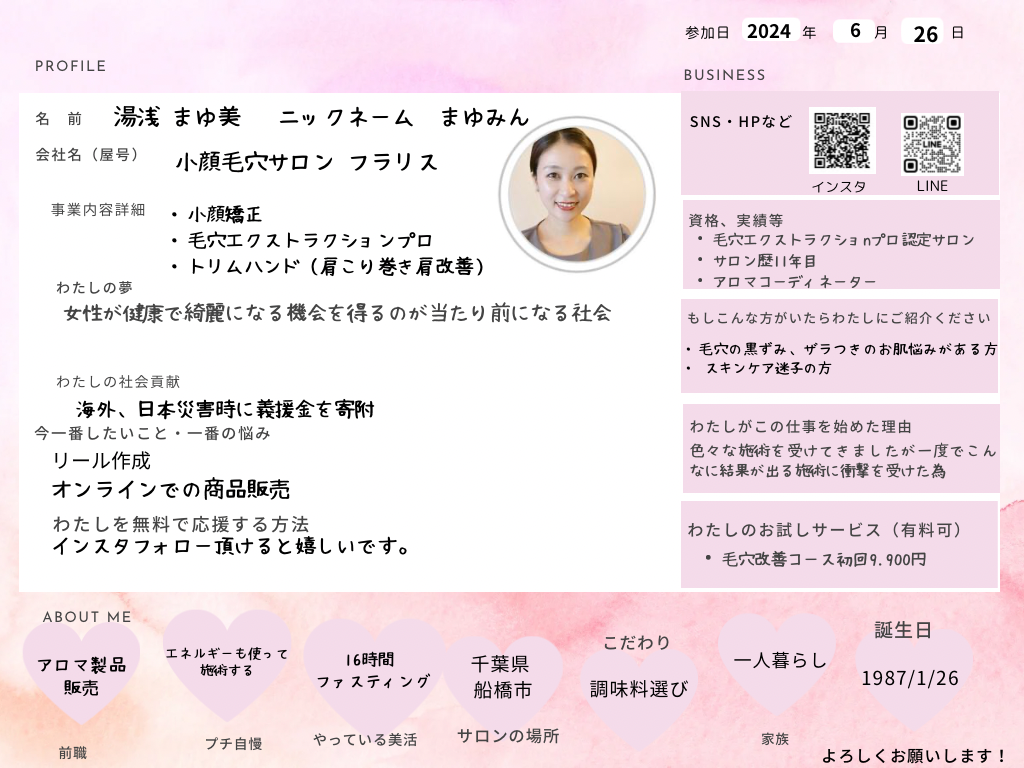 ひとこと: ひとりサロンオーナー部では皆んなで知識や経験談をシェアしてそれぞれの目標に向かって高めあっていける場になれば良いと思っております!宜しくお願いします。