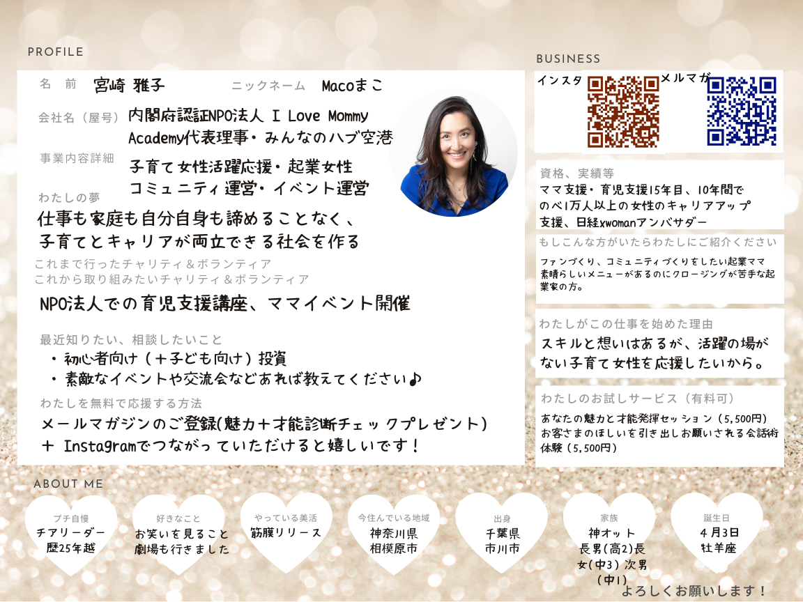 ひとこと: 魅力と才能開花の専門家。「みんなのハブ空港」主宰 宮崎雅子です。起業女性に向けて「売らずに売れる+愛され続ける」を叶える活動をしています!