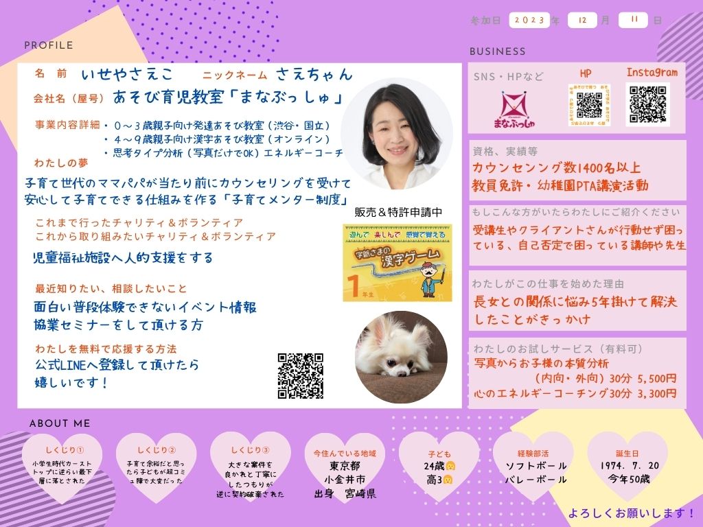 ひとこと: 子どもの困りごとを遊びで分析し、遊びで解決していく専門家です。性格分析を得意とし、本質に合った子育てをご提案します。