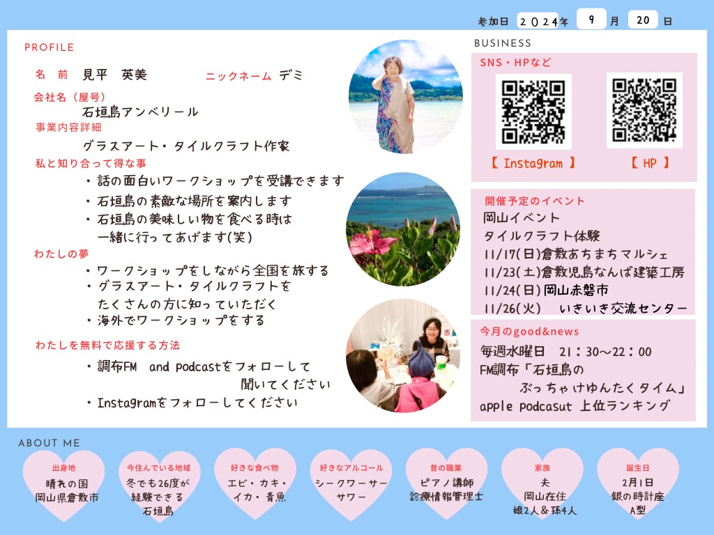 ひとこと: 石垣島を訪れる観光客の方に楽しんでいただける手作り体験のお店をしています。たくさんの方にインスタを見ていただき体験して貰えるよう日々奮闘しています!