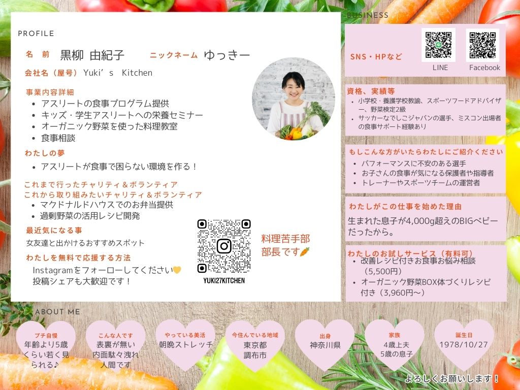 検索キーワード: アスリート食事サポート、野菜料理研究家、オーガニック野菜販売、料理教室、キッズアスリート、女子アスリート、野菜嫌い、偏食相談