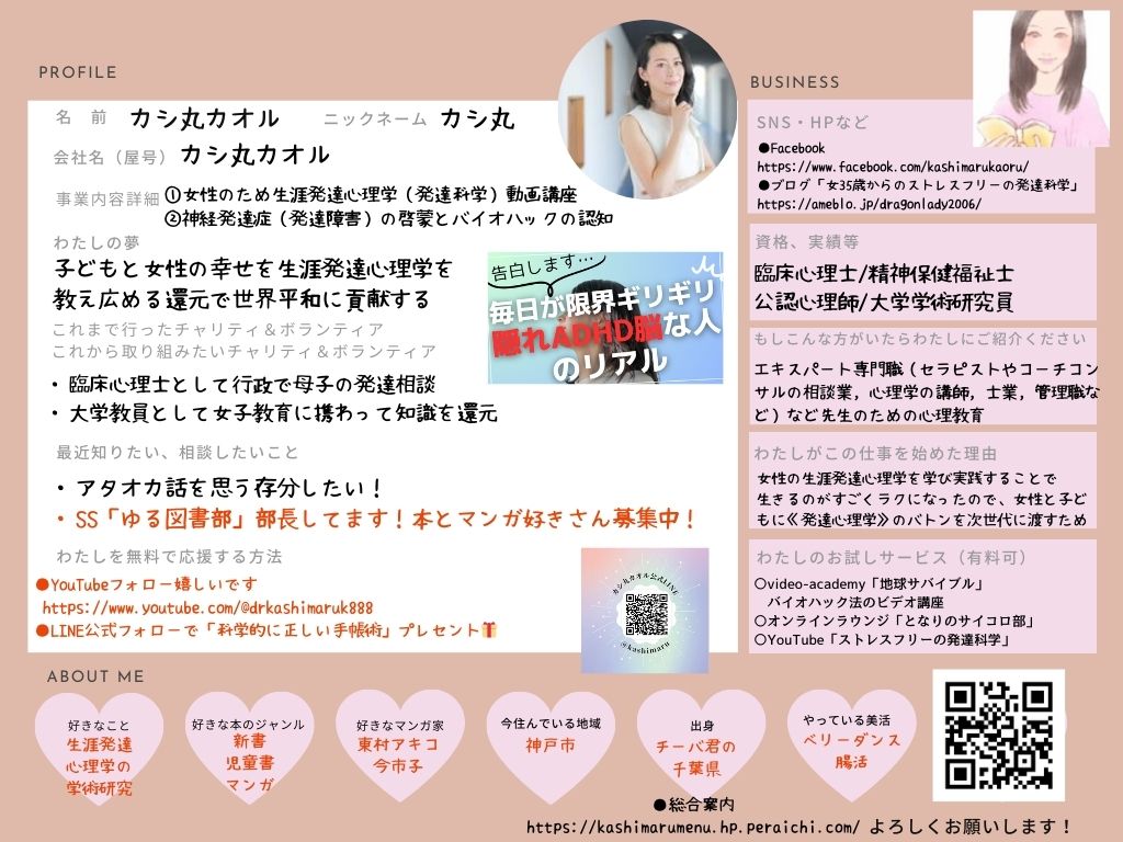 ひとこと: 心理学者で臨床心理士のカシ丸です。お堅く見られますが周りに助けられているADHD脳です。